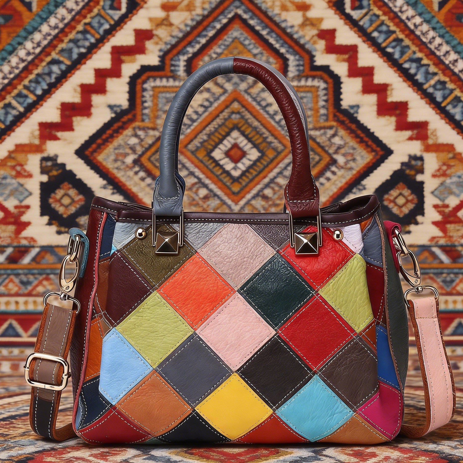 For the multi-color patchwork bags, the color blocks are arranged randomly, so the color combination of each bag will vary slightly.